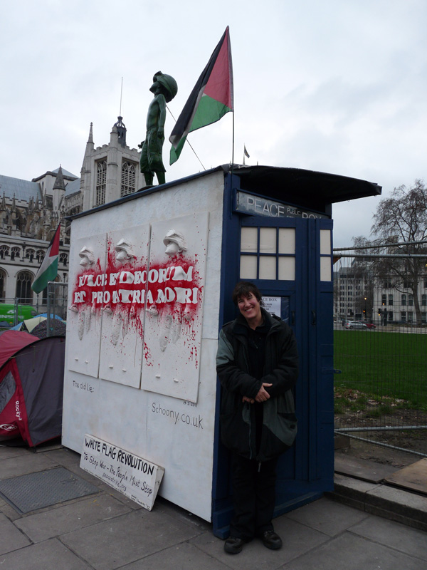 Maria Gallastegui lived on the then, Peace Camp on Parliament Square between 2006 -2012. She was ‘On Strike’ during her time there. The Peace Camp at the time was against the Afghan and Iraq war.