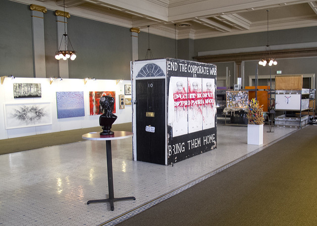After they were removed from Parliament Square the ‘peace plinths’ were on display in ‘The Peace Project’ exhibition in a central London gallery in 2012 and one made the trip to a gallery in Los Angeles (picture below). See more info and photos on the Internet Archive.